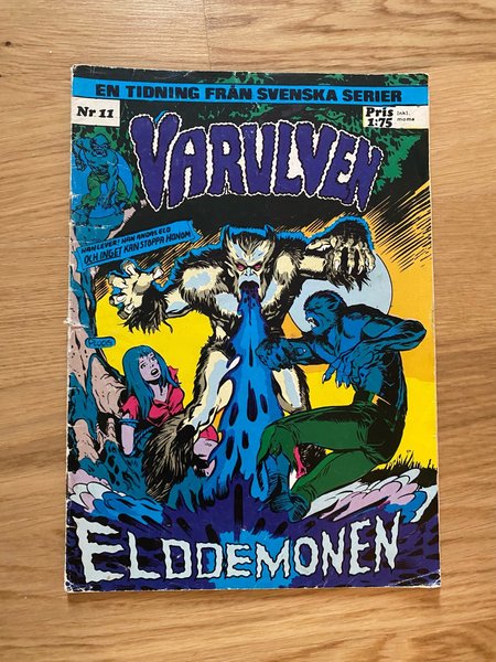 Tidningen "Varulven Nr 11" från Svenska Serier. Pris 1:75 inkl. moms. Omslaget visar texten "HAN LEVER! HAN ANDAS ELD OCH INGET KAN STOPPA HONOM" och "ELDDEMONEN".