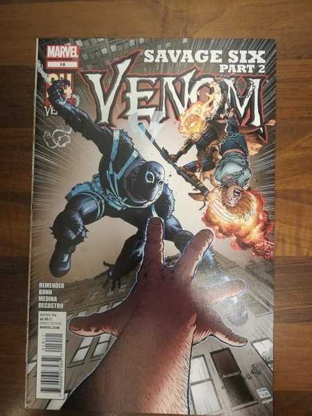 Cover by Tony Moore (W) Rick Remender, Cullen Bunn (A) Lan Medina Flash Thompson and Betty Brant are on the run and there's nowhere to hide! Venom's secret identity has been compromised... both to his enemies AND his friends! Cullen Bunn (WOLVERINE) teams with series regulars Rick Remender & Lan Medina as the Savage Six stage their most brutal attack on the people closest to Flash Thompson!The product picture is a photo of the actual comic so please study it carefully.