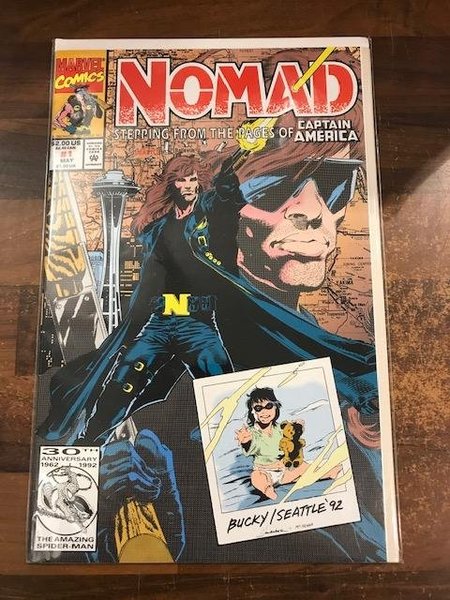 Cover pencils by Samuel Clarke Hawbaker, inks by Mark McKenna. Stepping from the pages of Captain America. 3-page fold-out "Wanted" poster. "The Favor Banker," written by Fabian Micieza, pencils by S. Clarke Hawbaker, inks by Mark McKenna, letters by Chris Eliopoulos, color by Joe Rosas; Origin of Nomad--Jack Munroe begins his new career in Seattle, as a hired vigilante, while caring for his adopted daughter, Bucky. 2-page spread for "Marvel Master Vision" game. Includes "Bullpen Bulletins."