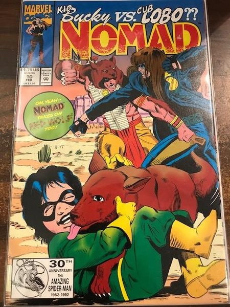 Raw Deals - Written by Fabian Nicieza. Art by Pat Olliffe & Mark McKenna. Illegal gambling on a Native American reservation outside Phoenix, AZ, brings Nomad face to face with Red Wolf! Nomad doesn't know which side to take when he finds out that the Federal Government is behind the racket. Also in this issue: Bucky vs. Lobo?!?