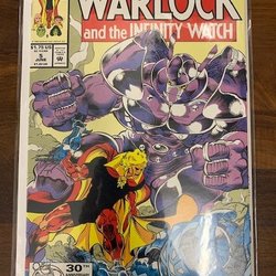 Infinity War Tie-In (Uncredited) - "The Island!" Story by Jim Starlin. Art by Tom Raney and Terry Austin. In the aftermath of last issues events, the Infinity Watch finds themselves on Monster Island. Here they run into the island's beastly residences and current ruler, the Mole Man. But, is the diminutive king here for a fight or to make a proposition? Plus, Warlock has a prophetic dream involving his evil counterpart the Magus, and the last person Warlock wanted to see, arrives seeking aid. 32 pages. (Thanos and Magus cameos)