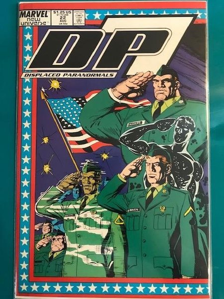 The Draft tie-in. "Army Dreamers!" Guest-starring Nightmask and Kickers, Inc. Story by Mark Gruenwald. Art by Paul Ryan and Danny Bulanadi. It's a turning point in the lives of DP-7 as the team joins the army and becomes fully deputized agents of the US Government. Meanwhile, the super-fast Jeffrey must deal with a recurring nightmare. Can the dreamscape hero known as Nightmask help him? Includes Marvel Handbook entries for Mastodon and the Paranormal Training Annex at Fort Benning, Georgia. Includes the Official Timeline of the New Universe.