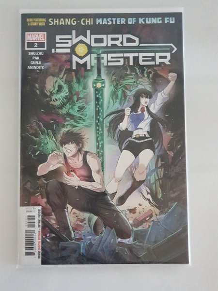 Written by Shuizhu and Greg Pak. Art by Gunji and Ario Anindito. Cover by Gunji. WHO'S YOUR MASTER NOW? SWORD MASTER'S origin story continues as he battles a demon from beyond - and awakens his black blade for the first time! But will the awakened sword prove more bloodthirsty than the demons themselves? And in our second story, SHANG-CHI and LIN LIE team up to search for Lin's father. But Lin's rashness and Shang-Chi's suspicion of all things magic set the stage for doom! 36 pages, full color.