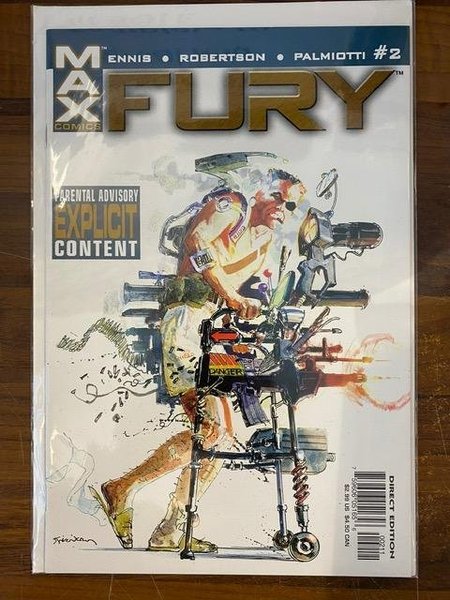 cover by bill sienkiewicz garth ennis/darick robertson/jimmy palmiotti ? THE SCOOP: Want a fast-paced, irreverent, war/spy thriller laced with a strong dose of very black humor? Then saddle up, soldier! ? THE SET-UP: FURY tells the story of an older, no wiser, and highly p.o.'d Nick Fury who's found himself more or less on the scrap heap and wants nothing more than to go back to the battlefield. The Cold War is over, and the days when S.H.I.E.L.D. and H.Y.D.R.A. engaged in complex games of strategy and espionage with the fate of the world at stake are gone. Or are they? ? THE STORY: H.Y.D.R.A. agent Rudi Gagarin has taken over a Third World island with the intent of starting World War Three. He's about to get what he wants -- in spades. ? THE CREATORS: You want intense? How's this lineup: Garth Ennis (PUNISHER, Preacher) on words, Darick Robertson (Transmetropolitan) on pencils, and Jimmy Palmiotti (PUNISHER) on inks! We even got Bill Sienkiewicz (ELEKTRA ASSASSIN) to supply covers! ? THE FORMAT: Each issue of this monthly, six-issue series will be 32 pages, with ads. ? THE WARNING: Contains explicit content. Recommended for Mature Readers.