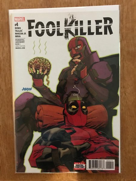 Written by Max Bemis. Art by Dalibor Talajic. Cover by Dave Johnson. Guest-starring Deadpool! Deadpool needs his favorite therapist back…but is Foolkiller ready to be there for him? Meanwhile, the Hood conspires with a foe from Foolkiller's past…