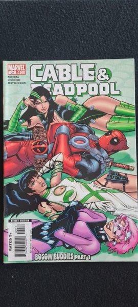 Written by Fabian Nicieza Pencils & Cover by Patrick Zircher. BOSOM BUDDIES Part 1 (of 4) Deadpool FINALLY gets hired for a job! There's a missing hard drive, and whoever gets it could very well own the world! Naturally, our Merc With a Mouth is going to find it first, right? Well...only if he can outwit that superspy known as the CAT, and slide by the undulating charms of three gorgeous and deadly snake chicks--that's right--Black Mamba, Asp and Diamondback are back in business as the B.A.D. Girls! And what's Cable doing during all of this...? Well, keeping an eye on Deadpool, since whoever owns the hard drive could very well own the world.