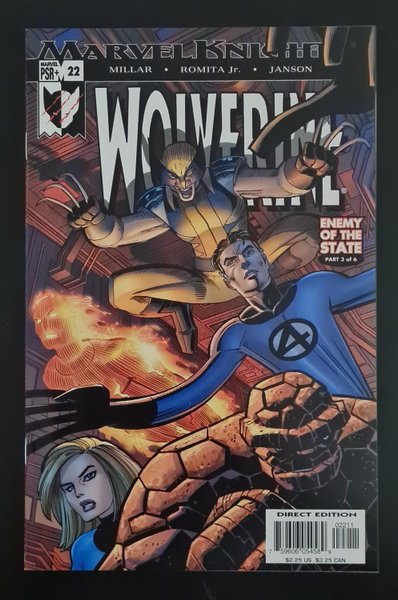 ENEMY OF THE STATE: Part 3 of 6 - Written by Mark Millar Art & Cover by John Romita Jr. & klaus janson The Fantastic Four is trapped in the Baxter Building with the world's deadliest weapon... Wolverine! Think this is as good as it gets for Wolverine? You tell us, folks ? all we're thinking right now is that four against one isn't a fair fight... for the Four, that is... 32 PGS./ MARVEL PSR+