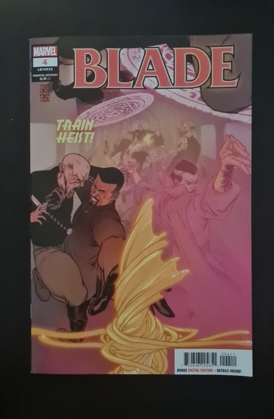 Written by Bryan Hill. Art by Valentina Pinti. Cover by Elena Casagrande. DOCTOR STRANGE JOINS BLADE ON A HIGH-SPEED HEIST! Blade must break into the armored fortress of a weapons collector to steal a sword of unknown power - the key to defeating the Adana. But the fortress isn't just heavily armored. It's mobile. Doctor Strange guest-stars in this action-packed heist that gives new meaning to the term "bullet train"! 32 pages, full color. Rated Parental Adv.