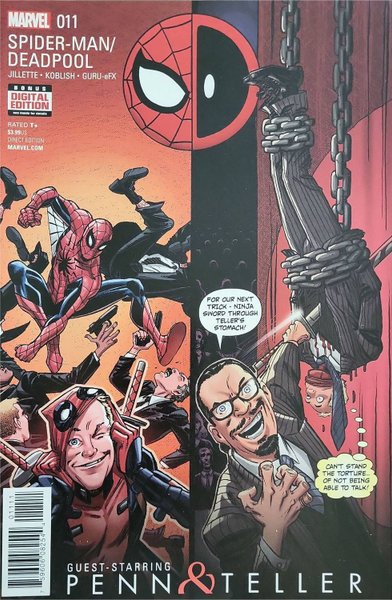 Written by Penn Jillette. Art and Cover by Scott Koblish. SPIDER-MAN & DEADPOOL meet PENN & TELLER… …and trade partners! Can Deadpool be Teller?!? Can Teller be Deadpool?!? Written by Penn Jillette of Penn and Teller, while Joe Kelly and Ed McGuinness get ahead on their next issue!