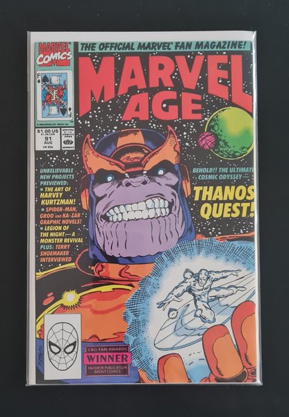 Pro File: Erik Larsen, including a self portrait by Larsen; a look at the Wild Cards limited series, with comments from Lew Shiner; a look at the Spider-Man graphic novel by Charles Vess; a look at the Ka-Zar graphic novel; 'Willie Lumpkin' strip by Stan Lee and Dan DeCarlo; 2-page Fred Hembeck strip; a look at Thanos Quest, with comments from Jim Starlin; a look at Legion of Night, with comments from Ralph Macchio and Steve Gerber; The Many Faces of the Thing; a look at Harvey Kurtzman's Strange Adventures; Marvel Age of Comics: 1982 (Part I); New Talent Department - Terry Kavanagh comments on the art of Mac Myers. Thanos and Silver Surfer cover by Ron Lim.