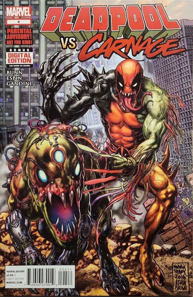 Written by Cullen Bunn. Art by Salva Espin. Cover by Glenn Fabry and Adam Brown. Will Carnage spread Deadpool all over the landscape? Or will Deadpool talk the scarlet sociopath's ear off? Find out in the conclusion to the 2014 Insanity Cup!