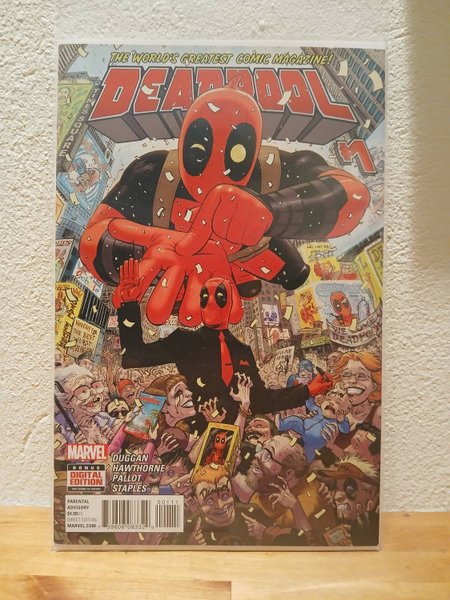 Written by Gerry Duggan. Art by Mike Hawthorne. Cover by Tony Moore. He's annoying. He's dangerous. He smells terrible. But the public love him. That's right-the Merc with the Mouth may make money for missions of murky morality...but he's become the most popular hero in the world for it. Eat that, Spidey! The world belongs to...DEADPOOL. 36 pages, full color. Parental Advisory