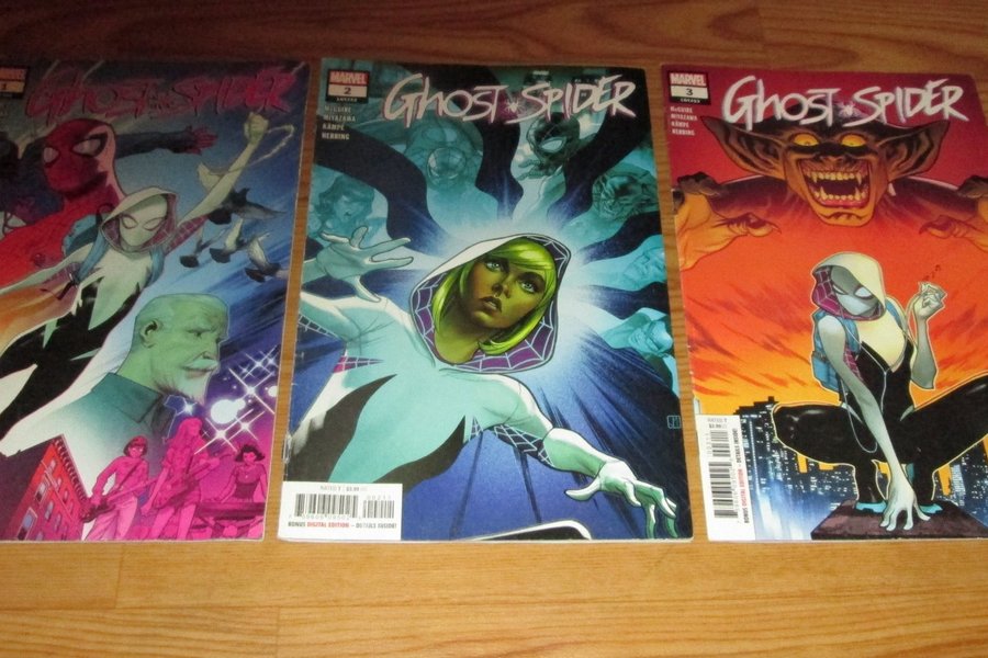 Samling av Ghost-Spider serietidningar, nummer 1 till 3.