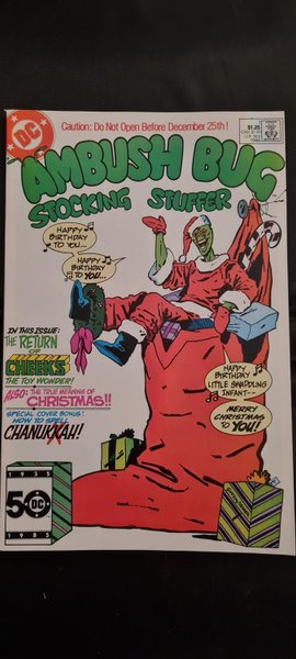 Yes, Cheeks, the Toy Wonder, is back! And so is Ambush Bug! Jam-packed with crisp copy, snappy dialogue, hilarious illustrations and outrageous weirdness, this special 'stocking stuffer' is not to be missed! Yes, it's Ambush Bug's hilarious insights into the characters of and at DC Comics! Script by Robert Loren Fleming, pencils by Keith Giffen, inks by Bob Oksner. Cover by Giffen and Oksner.