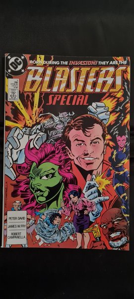 They never asked to become super-heroes. But now that they are, they have no choice but to do what super-heroes do best...risk their lives combating the forces of evil wherever they're found. The Blasters were a group of ordinary men and women...until the events chronicled in the pages of INVASION. Fifty human beings were abducted by the Dominion and left alone in a minefield - a minefield filled with experimental explosives that killed all but seven. These seven joined the ranks of metahumans as detailed in the pages of Invasion (1988 DC) #1. With the war over, some accept their powers and run with them. Others just want to forget and resume normal lives. But you know how those forces of evil can be. So when the Spider Guild reveal themselves in their pursuit of the Omega Men, what choice do these reluctant heroes have? That's why they become The Blasters. And that's where the action begins. Written by Peter David, with art by James W. Fry and Robert Campanella. Cover by Fry and Campanella. 52-page one-shot special.
