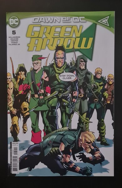 Written by Joshua Williamson. Art by Sean Izaakse, Phil Hester. Cover by Phil Hester. PAST, PRESENT, AND FUTURE OLIVER QUEENS COLLIDE! Past, present, and future Oliver Queens fight for who gets to return home! But at what cost?! Arsenal and Black Canary are joined by an unlikely ally in their hunt for Amanda Waller, and they uncover a large piece of the Dawn of DC puzzle! 32 pages, full color. Rated T+