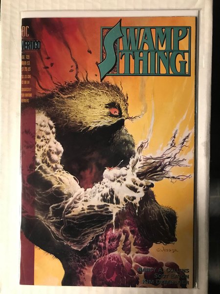 In "Swamp Fever," a hallucinating Swamp Thing, poisoned by toxic waste and cut off from the Green, must shamble his way home, reliving the most horrible moments of his life while undergoing radical mutations. Part 1 of 3. Written by Nancy A. Collins, with art by Scot Eaton and Kim DeMulder. Painted cover by Charles Vess with an added fifth color. Suggested for Mature Readers. New Format.The product picture is a photo of the actual comic so please study it carefully.