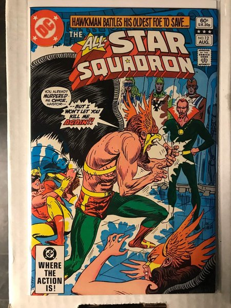 Cover art by Joe Kubert. Doomsday Begins at Dawn!, script by Roy Thomas, pencils by Adrian Gonzales, inks by Jerry Ordway; As Hawkman and Dr. Hastor reveal their origins, the All-Star Squadron need to stop Hastor from using the Eye--a gigantic air fortress built for peace--as a weapon of destruction. 36 pgs.The product picture is a photo of the actual comic so please study it carefully.