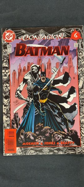 Contagion Part 6 of 11: Tears of Blood - Written by Doug Moench. Art and Cover by Kelley Jones and John Beatty. Azrael returns to Gotham City with a possible vaccine for the plague and Batman sends it with Poison Ivy into the barricaded Babylon Towers, where the city's most powerful citizens are dying. Meanwhile, Robin, Nightwing and the Huntress try to stop a looting, panic-stricken mob! 36 Pages, Full Color.