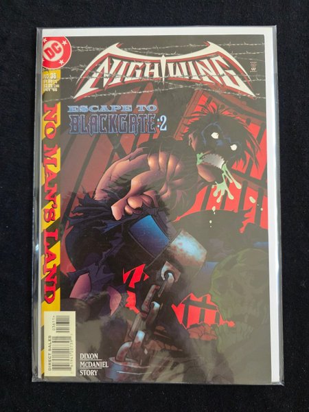 Written by Chuck Dixon; art and cover by Scott McDaniel and Karl Story. Part 2 of Nightwing's 3-part "No Man's Land" adventure! Trapped in the bowels of Blackgate, Nightwing must convince the other inmates to aid him in his escape. And, if he succeeds, he has to figure out what to do after he's released dozens of Gotham City's most insane and deadly costumed villains. FC, 32 pg.$1.99" Batman No Man's Land