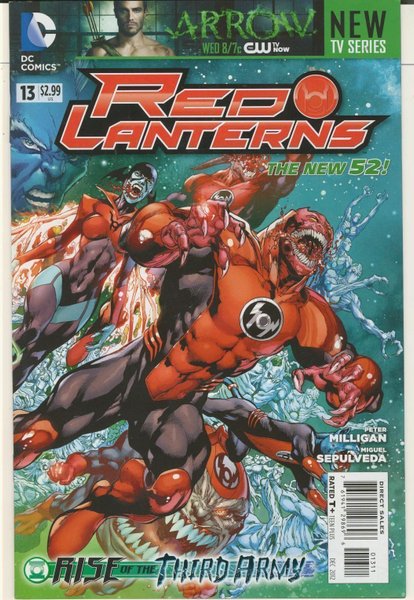 Red Lanterns #13 från DC Comics, publicerad i december 2012. Serietidningen är skriven av Peter Milligan och Miguel Sepulveda.