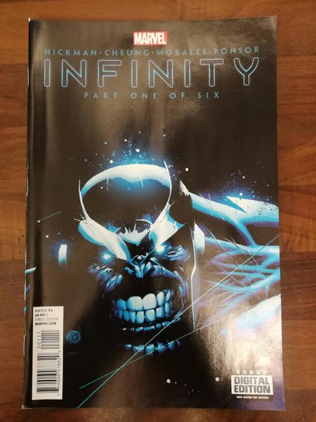 First Printing (W) Jonathan Hickman (A) Jim Cheung (CA) Adam Kubert The oversized kickoff to the year's most anticipate Blockbuster summer event, chaning the way you view the Marvel Universe! The outbreak of war on two fronts: Earth and Space, with our heroes torn between them. The world-shattering return of Thanos! Includes material from FREE COMIC BOOK DAY: INFINITY"The product picture is a photo of the actual comic so please study it carefully.