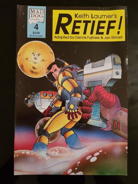 Cover art by Dennis Fujitake. "Saline Solution," script by Keith Laumer (story), Dennis Fujitake, and Jan Strnad, art by Dennis Fujitake; Retief tries to settle a mining claim; Adapted from the short story by Keith Laumer