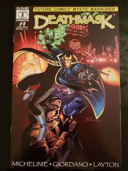 by Michelinie, Giordano, & Layton Future Comics introduces a new kind of protagonist to their universe: the mystic marauder known in the deepest shadows as... Deathmask! A Native American shaman, Deathmask had gained fame as an illusionist, augmenting trickery with actual magic, until he'd suffered an unimaginable loss at he hands of organized crime. Now vengeance is his god, and he serves that deity with zeal, blood and abandon. Wielding a quantum science so advanced that it can only be viewed as supernatural, St. Synn fights fire with fire, relishing the agony he brings to those who would cause pain to innocent citizens. To him, justice is worth any cost ? even the dark price he himself had paid to gain his powers.