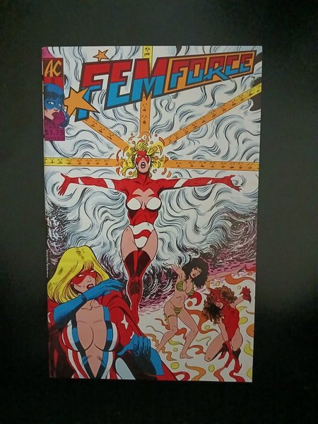 Cover pencils by Robert Walker, inks by Bill Black. Girl Talk, script and inks by Bill Black, pencils by Robert Walker; Another cast member is added, and the origin of Synn, the Girl From Lsd is recapped; strange alien apparitions are the result of Synn's powerful mind in stasis, so the Femforce's sorceress supreme, Nightveil vows to take her to a dimension where her mind will be left free to expand; guest-stars Stella Stargaze and T. C. Fremont, Janice Lawson, The Brotherhood Of Purity and Farkas, with cameos of Atomman and Alizarin Crimson. 36 pgs