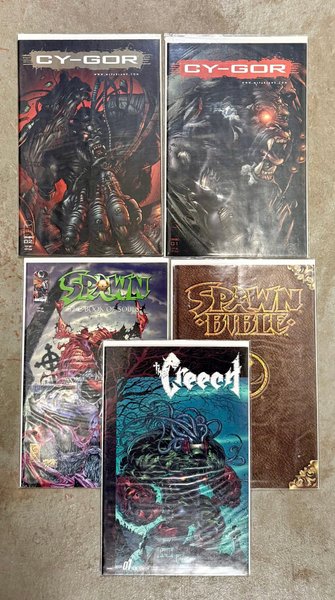 Samling av serietidningar inklusive Cy-Gor nummer 1 och 2, Spawn: The Book of Souls, Creech och Spawn Bible.