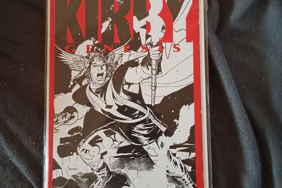 Tegneseriehæfte med titlen "Kirby Genesis" nummer 2. Forsiden viser en sort-hvid illustration af en muskuløs figur med vinger og et våben, omgivet af en rød ramme. Udgivet af Dynamite.