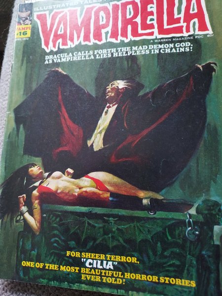 Vampirella nummer 16 från April 1972. Dracula kallar fram den galna demonguden, medan Vampirella ligger hjälplös i kedjor!