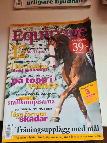 Tidningen Equipage, Sveriges ledande livsstilsmagasin för ryttare. Vinter 2008-2009. Innehåller artiklar om hoppövningar med Lisen, Tobbe Larsson om lydnad, att behålla ridlusten på topp under vintern, julknytis med stallkompisarna, Bo Tibblin om låg form och träningsupplägg med mål av Janne Jönsson.