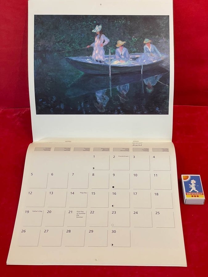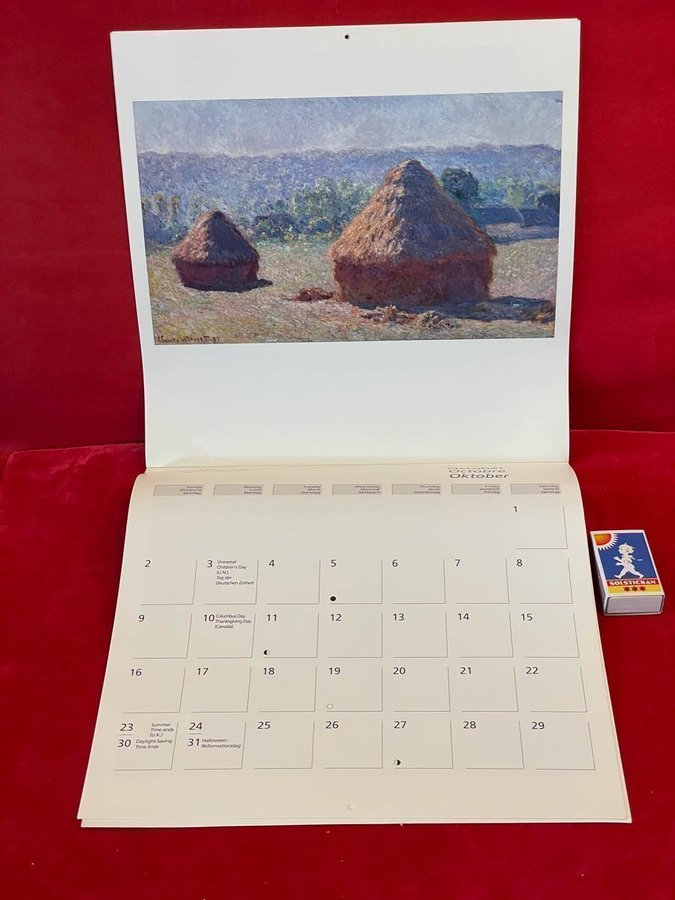 En oskriven fräsch konstkalender med Claude Monets vackra målningar från 1994 borde vara den perfekta presenten till den person haft en bemärkelsedag då. Perfekt för en samlare eller konstälskare.