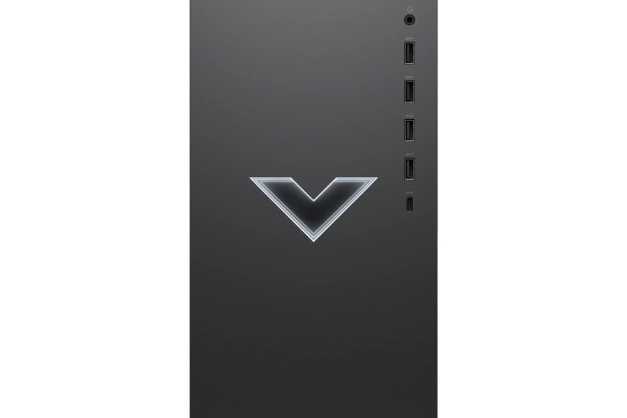 Stationär dator från HP, modell Victus. Enheten har flera portar på framsidan, inklusive USB-A, USB-C, hörlursuttag och strömknapp.
