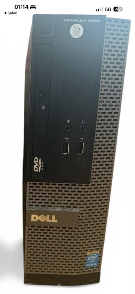 Dell Optiplex 3020 stationär dator med Intel Core i5-processor. Datorn har en inbyggd DVD-ROM-enhet och USB-portar på framsidan, samt anslutningar för mikrofon och hörlurar.