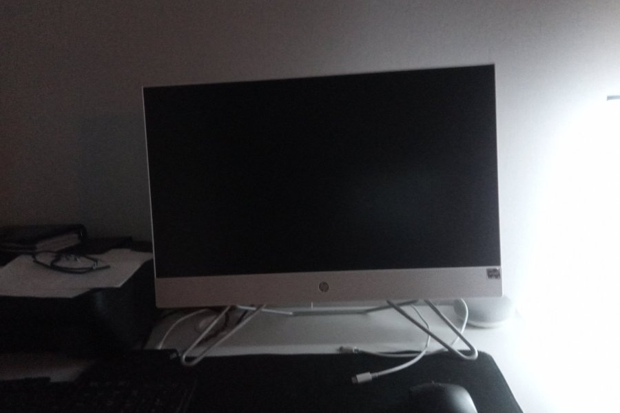 HP All-in-One dator. Denna stationära dator har en integrerad skärm och är utrustad med en AMD Ryzen-processor.
