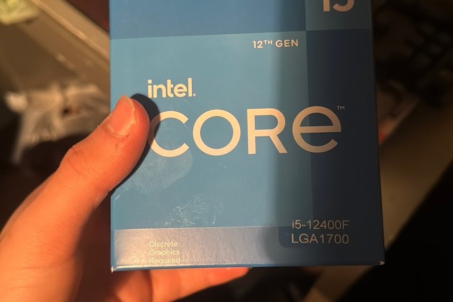 Intel Core i5-12400F processor. Denna processor är av 12:e generationen och använder LGA1700-sockeln. Den kräver ett separat grafikkort för bildutgång.