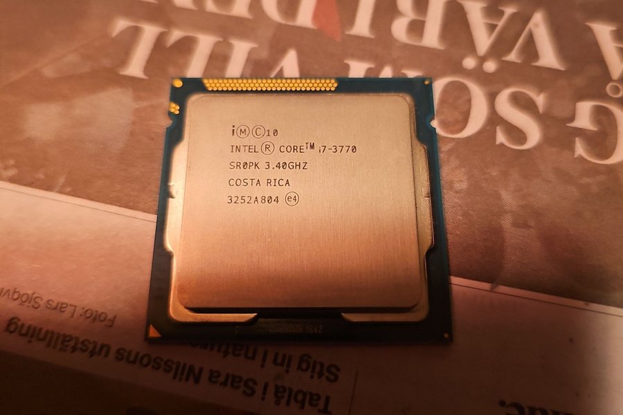 Intel Core i7-3770 processor med en klockfrekvens på 3.40GHz. Modellbeteckningen är SR0PK och den är tillverkad i Costa Rica. Serienumret är 3252A804.
