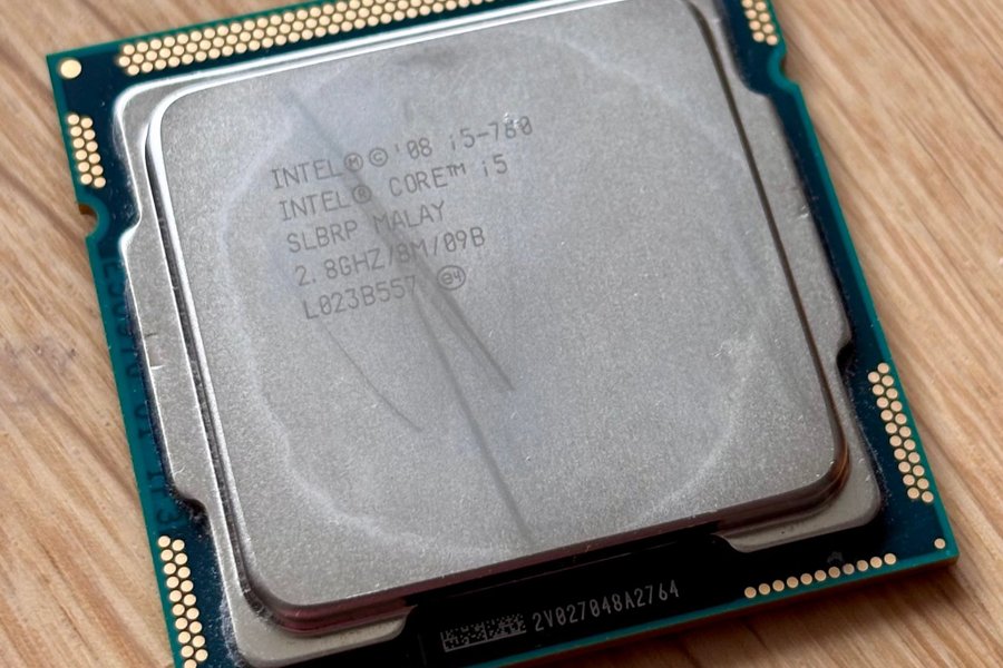 Intel Core i5-760 processor med en klockfrekvens på 2.8GHz. Modellen är SLBRP och tillverkad i Malaysia. Den har 8M cache och en buss på 09B. Serienummer L023B557 och 2V027048A2764.