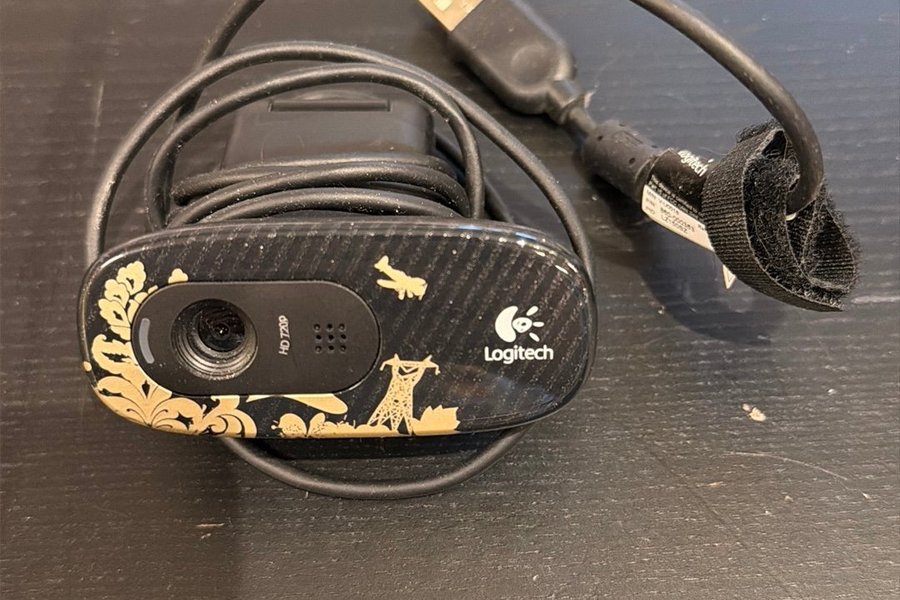 Logitech webbkamera med HD 720p-upplösning. Kameran har en svart design med guldfärgade detaljer och en USB-anslutning.