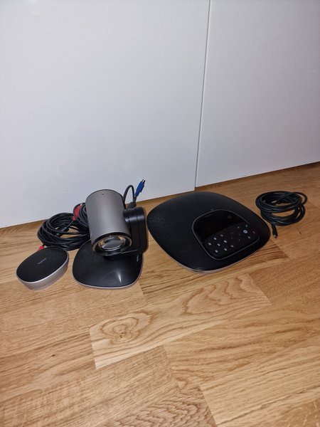 Logitech Group videokonferens. Innehåller en kamera, en högtalartelefon och en fjärrkontroll. Systemet är designat för att underlätta videokonferenser med hög kvalitet.