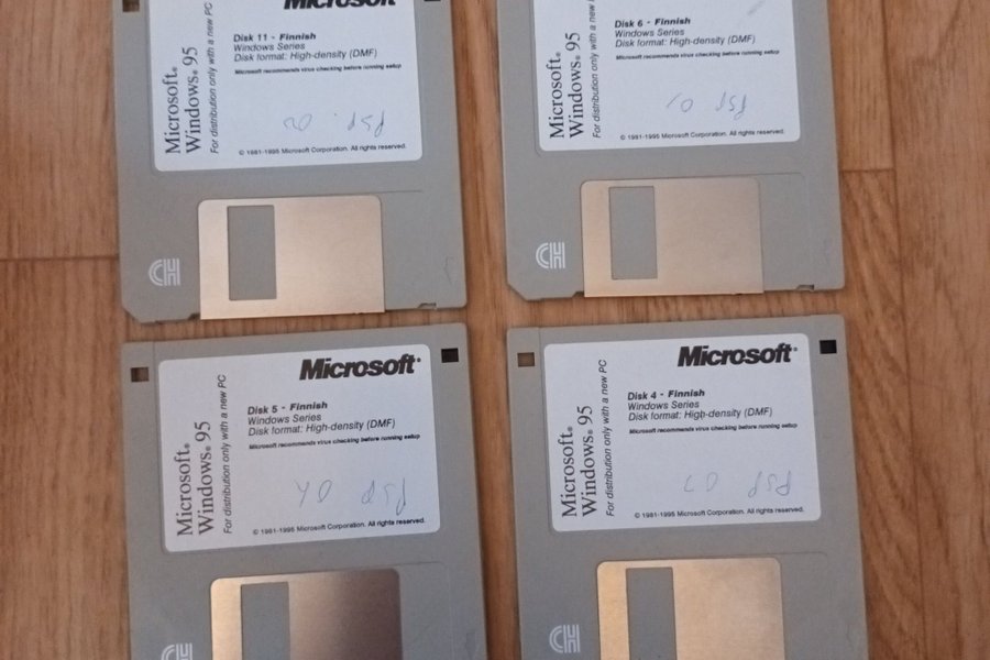 Fyra stycken disketter för Microsoft Windows 95, Finsk version. Diskett 4, 5, 6 och 11.