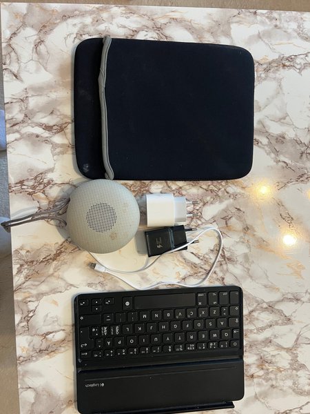 Tangentbord samt väska till iPad. Adapter USB och USBC , samt en högtalare och laddare