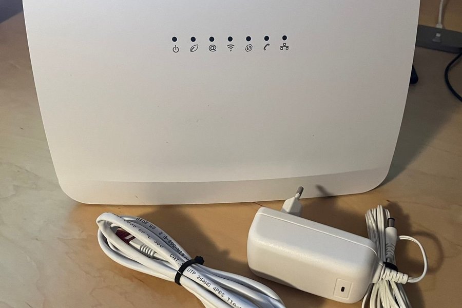 5G Telia router med tillhörande strömadapter och nätverkskabel.