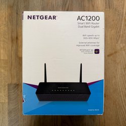 Router för trådlöst nätverk. Ansluts med strömkabel. Har flera portar för nätverkskablar.