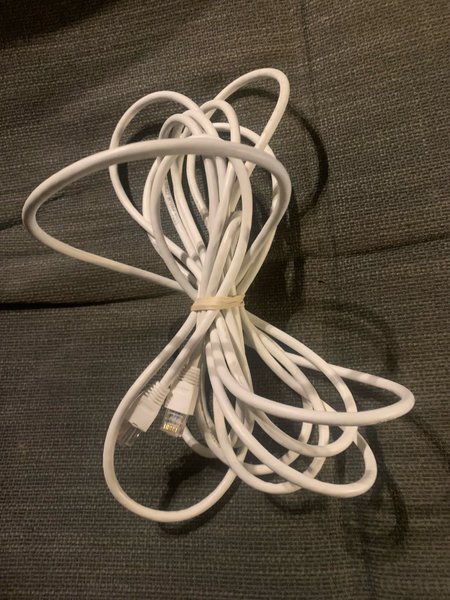Nätverkskabel för anslutning av enheter. Kabeln är vit och har RJ45-kontakter i båda ändar. 5 meter. Se: https://www.clasohlson.com/se/p/38-8977