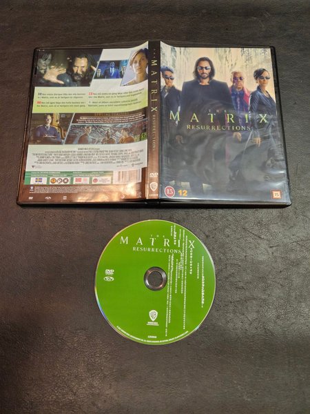 DVD-utgåva av The Matrix Resurrections med Keanu Reeves och Carrie-Anne Moss. Filmen har svensk text.