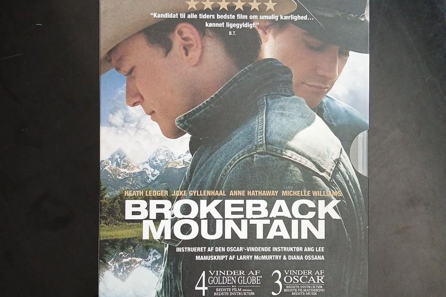 DVD-udgave af filmen "Brokeback Mountain" med Heath Ledger, Jake Gyllenhaal, Anne Hathaway og Michelle Williams. Filmen er instrueret af Ang Lee og har vundet 4 Golden Globes og 3 Oscars.
