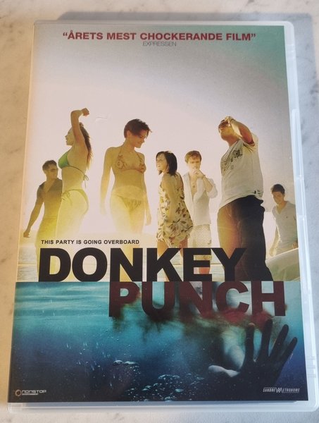 Donkey Punch på DVD. Filmen beskrivs som "Årets mest chockerande film" av Expressen. Texten "This party is going overboard" finns också på omslaget.